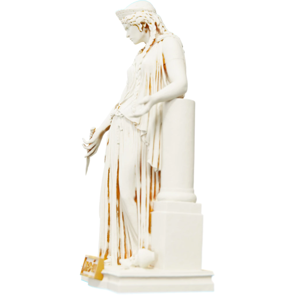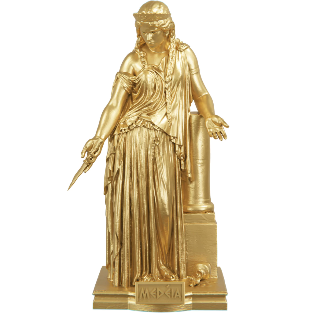 Essa estátua retrata Medeia em toda a sua intensidade. Seus olhos expressam a dor e a raiva acumuladas, enquanto sua postura orgulhosa revela sua força interior. Cada detalhe, desde os cabelos serpenteantes até as vestimentas intrincadas, reflete a riqueza do mito e a habilidade do escultor em capturar a essência dessa figura lendária.