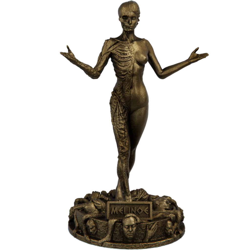Melinoë caminha entre os vivos e os mortos, uma sombra errante na noite. Filha de Perséfone e, segundo alguns mitos, de Hades ou mesmo de Zeus, ela carrega em si a dualidade do mundo inferior. Seu corpo é descrito como metade escuro, metade luminoso, refletindo sua origem dividida entre a luz do Olimpo e as trevas do submundo. Quando vaga, os mortais sentem um arrepio gelado, um sussurro ao vento que parece vir de um lugar que não pertence ao nosso mundo.